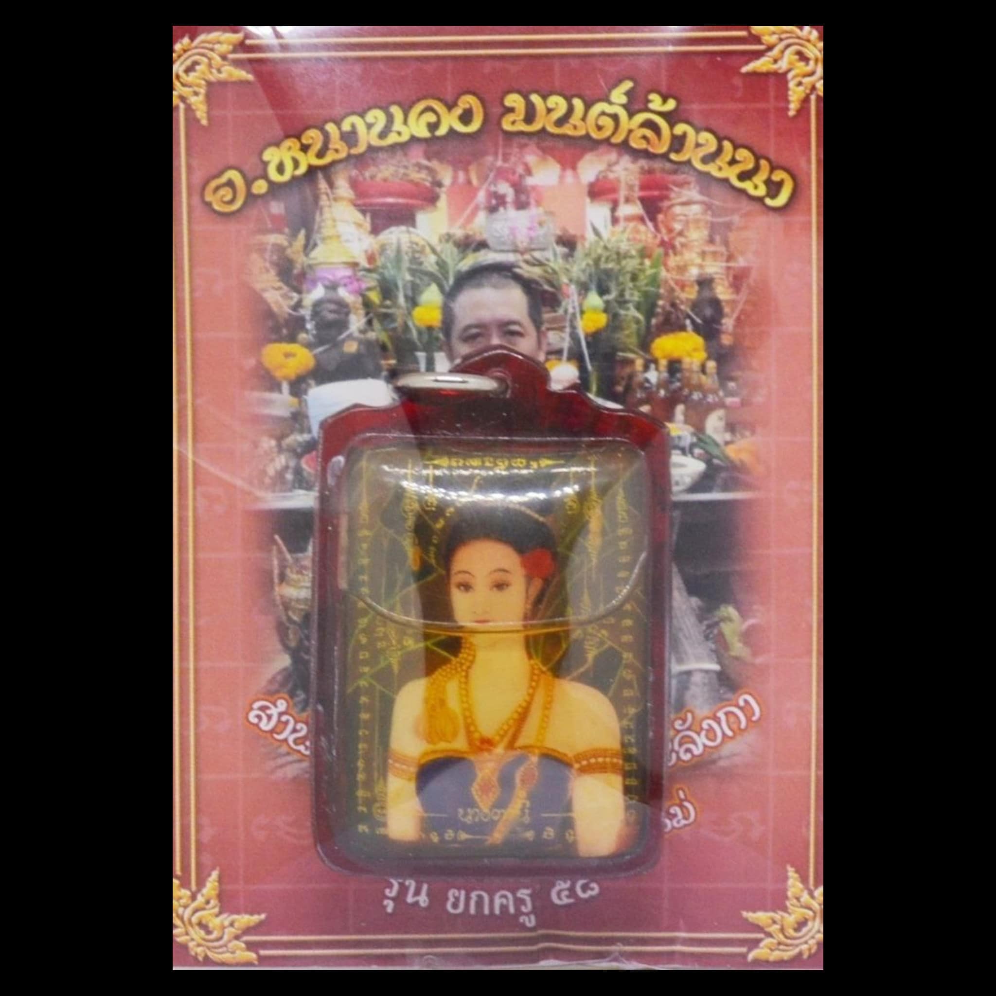 Dieses Mae Prai Tanee Medaillon wurde mit heiligem Öl gesegnet, das von Ajarn Nan Kong vom Wat Sakyant Pu Yai Chai Yan Langka in der Provinz Chiang Mai getragen wurde. Das bezaubernde Medaillon birgt die Essenz von Mae Prai Tanee , einem mythischen weiblichen Geist, dem übernatürliche Kräfte zugeschrieben werden.