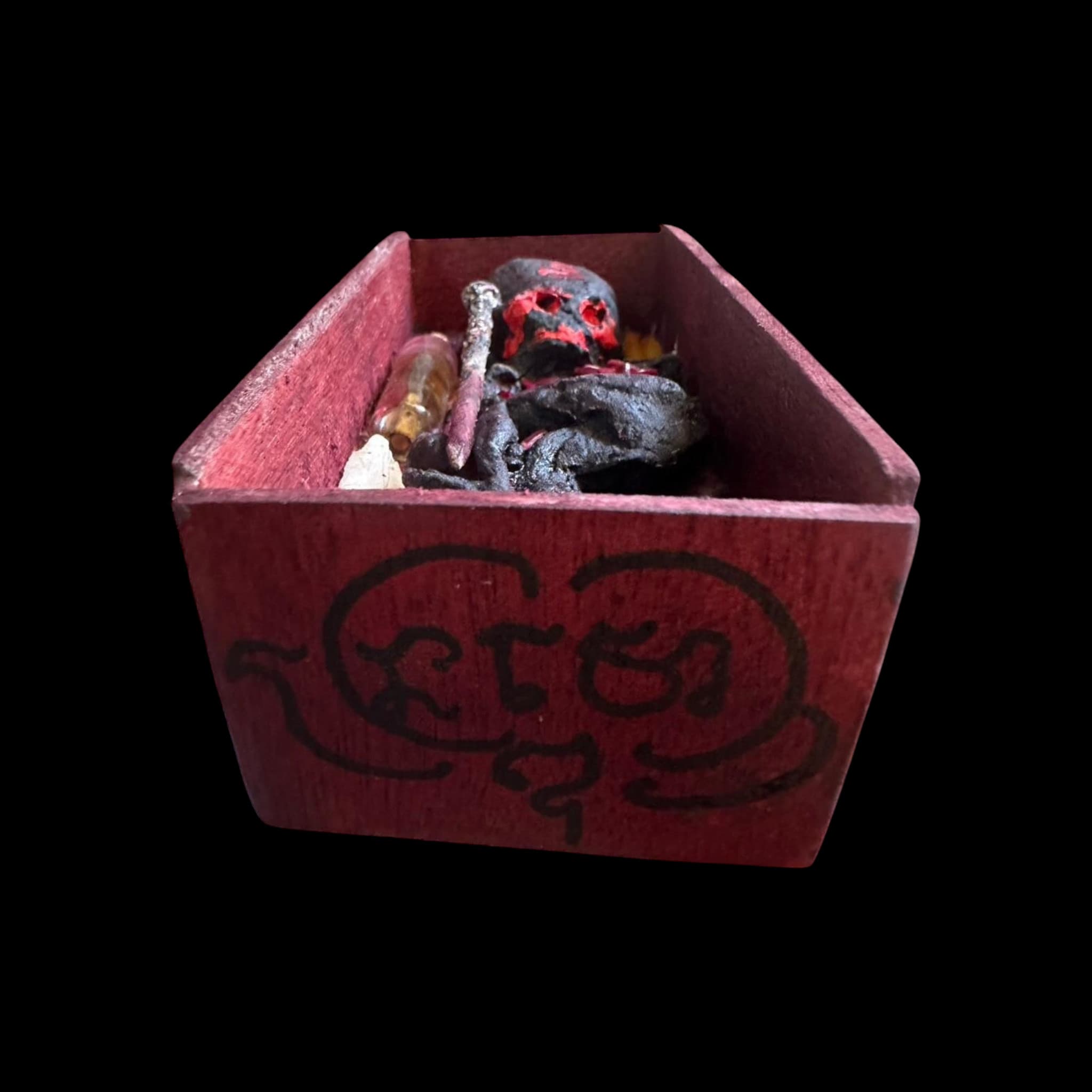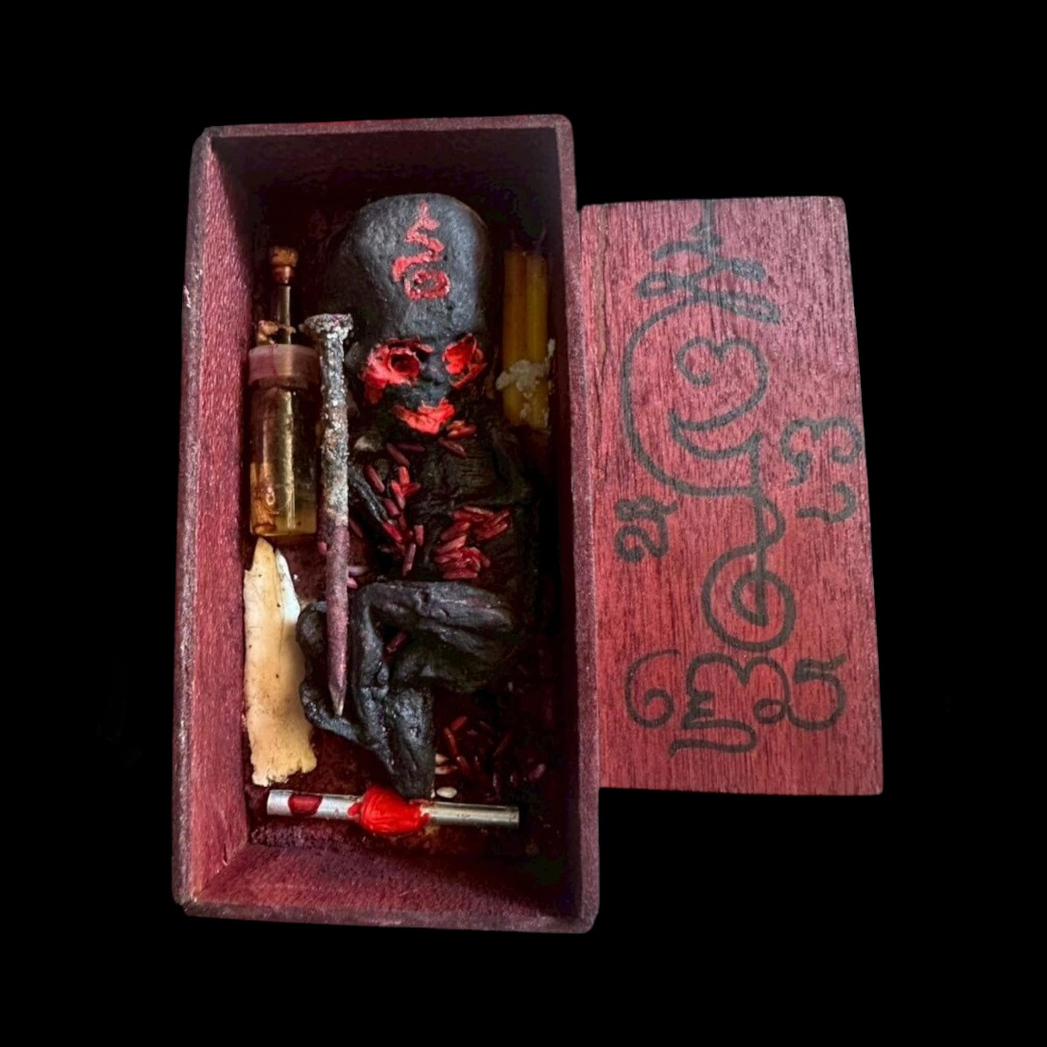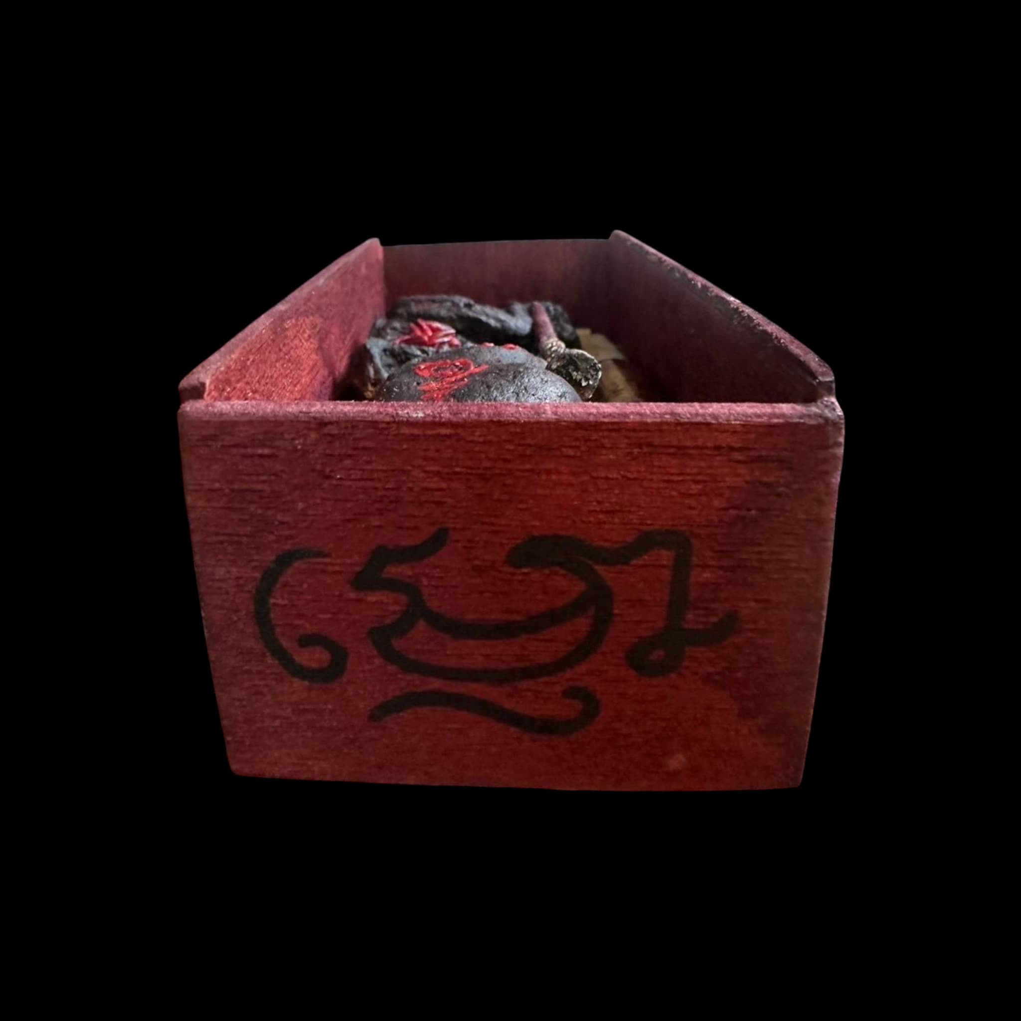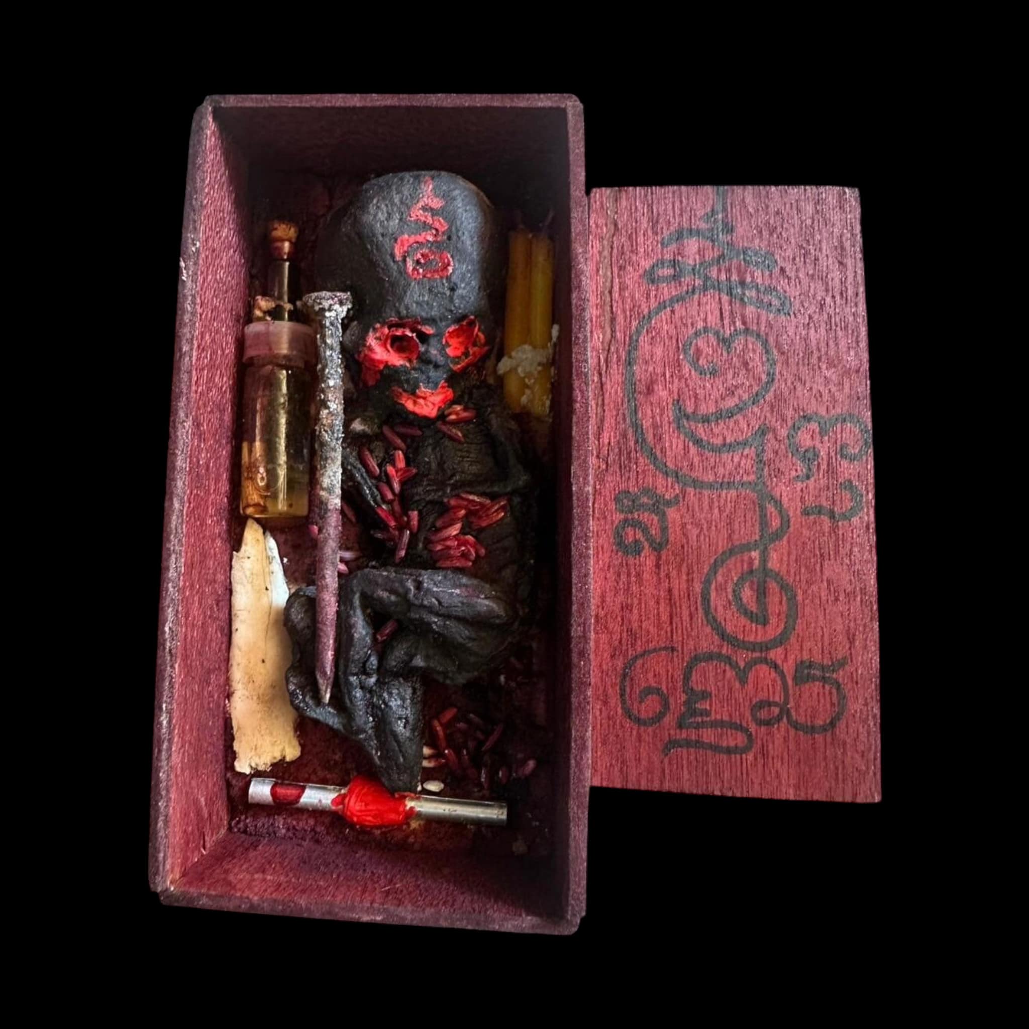 Dieser schwarze Prai Luk Krok ist ein kraftvoller spiritueller Talisman, gefertigt von Ajarn Saparo Kan . Die Puppe besteht aus Holz und ist mit heiligen Materialien angereichert, die aus sieben Friedhofsböden . Diese wurden mit Kuman-Thong-Kräutern, Phrai-Kuman-Pulver und Luk-Krok-Phrai-Pulver und mit alten Mantras und elementaren Segnungen aufgeladen.