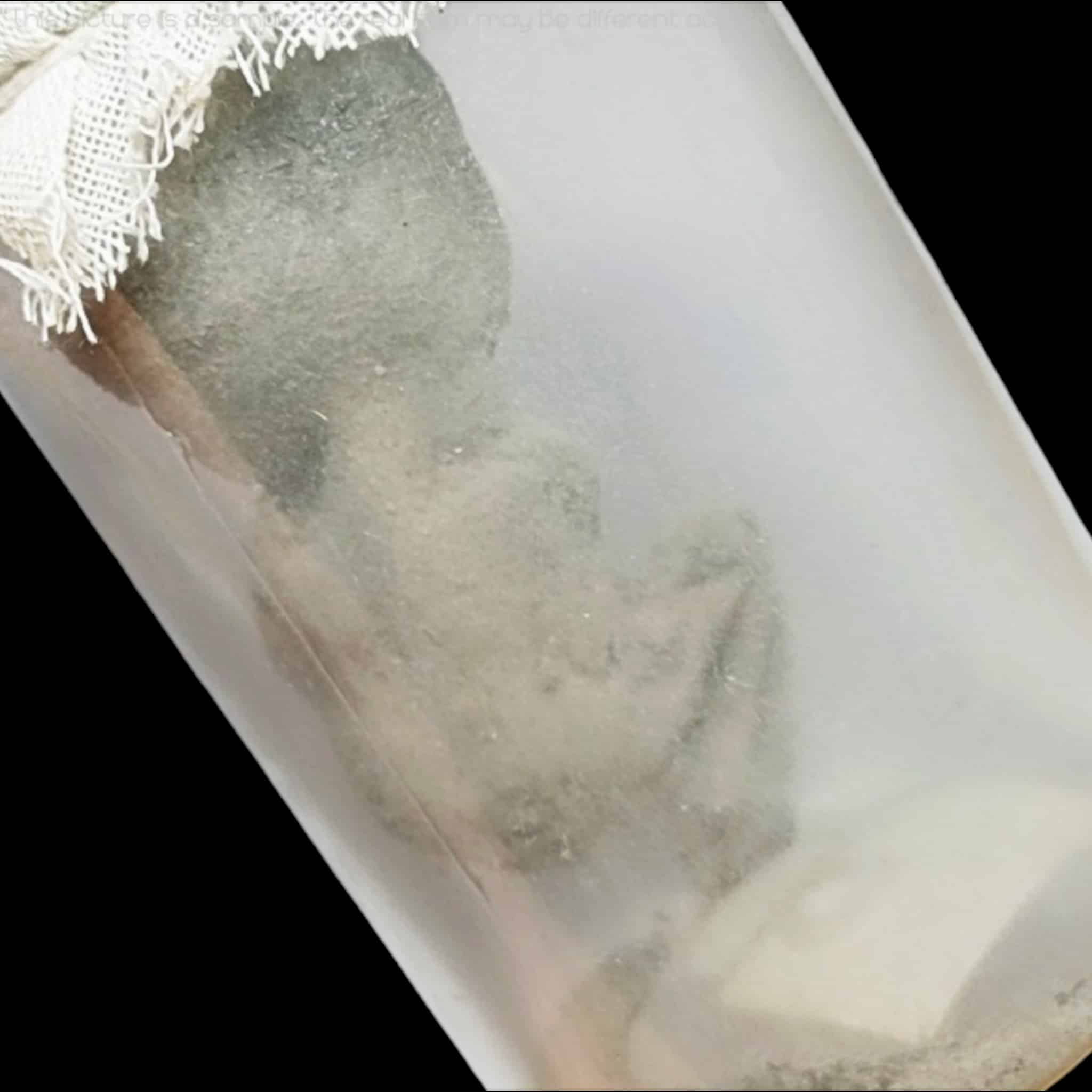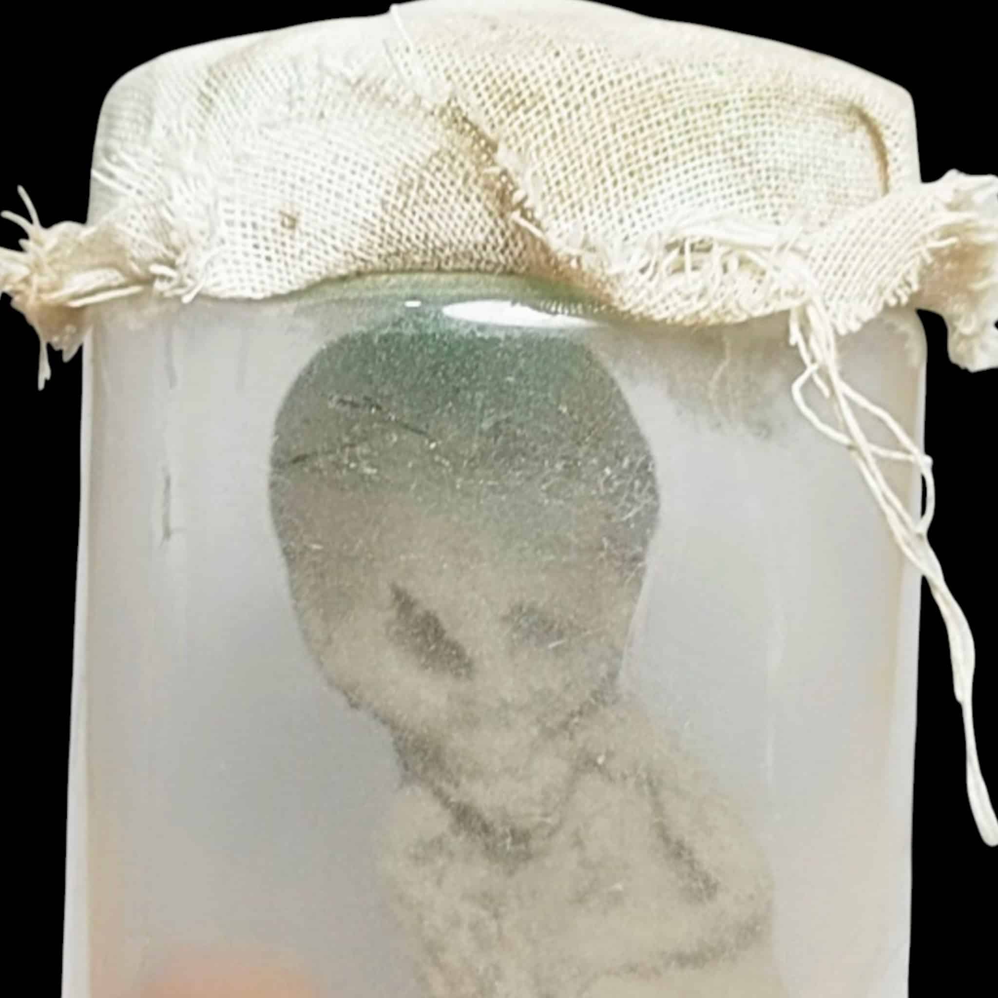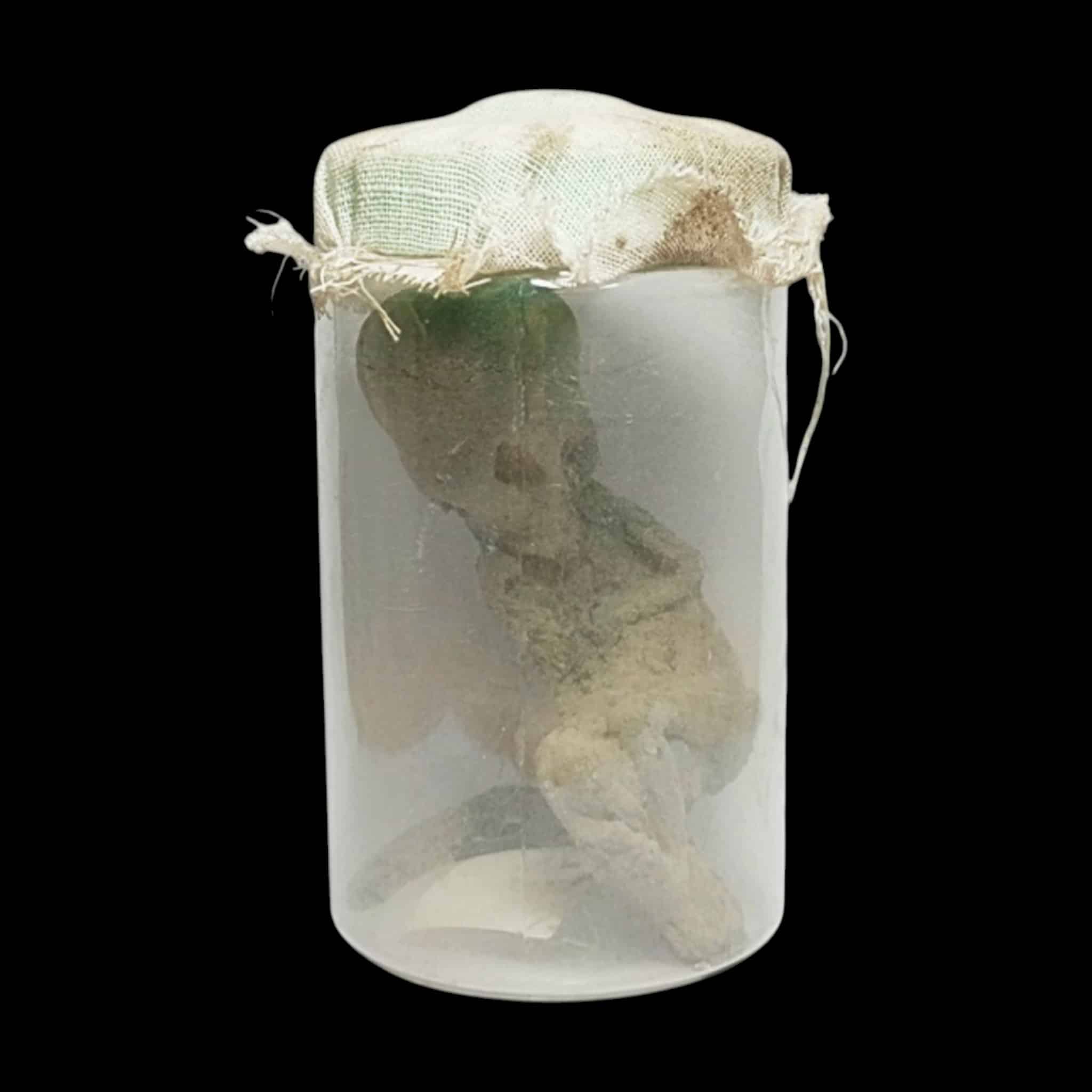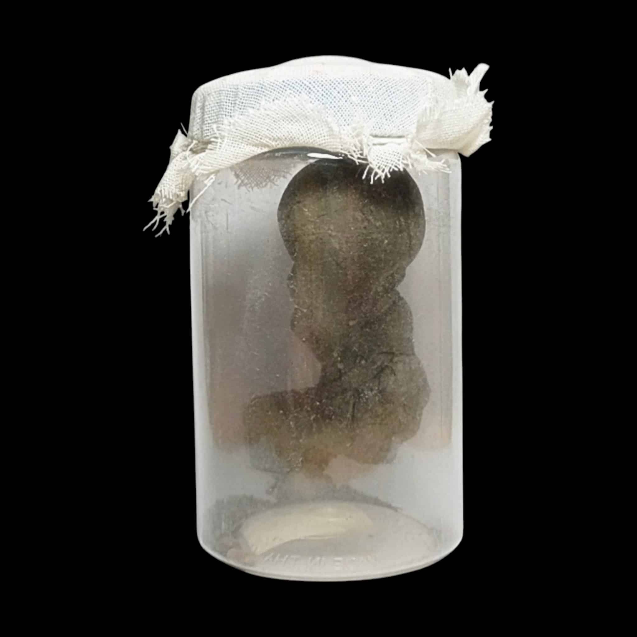 La parte superiore del barattolo è sigillata con un autentico telo funebre , che esalta la potenza spirituale del pezzo.