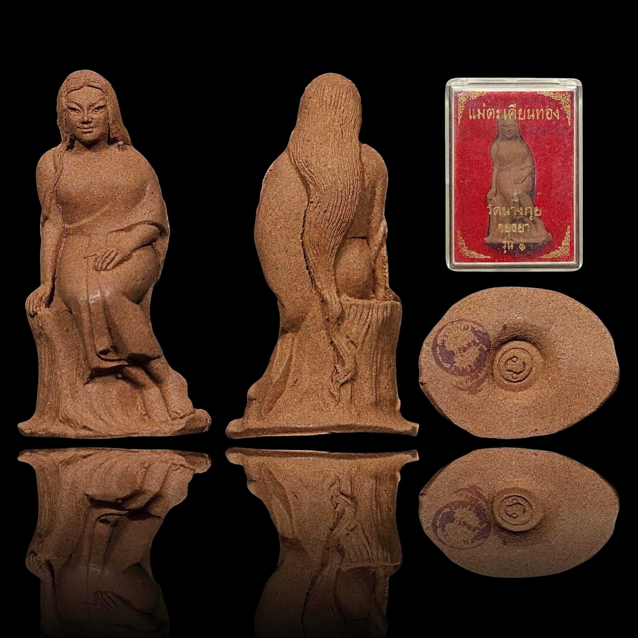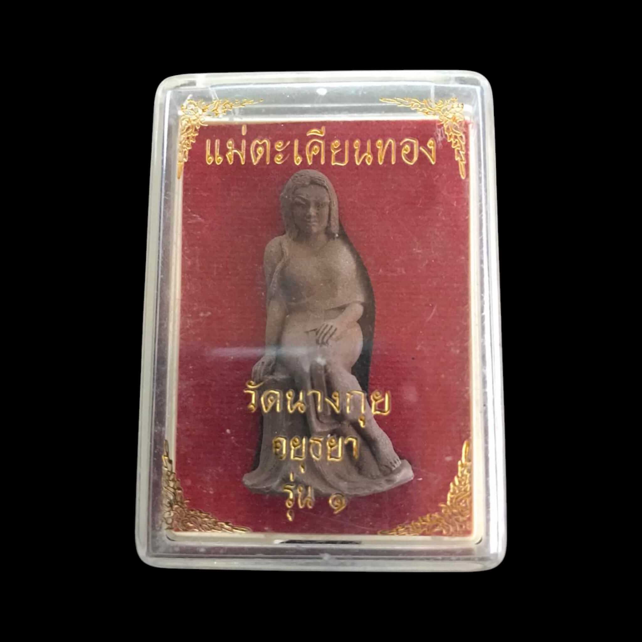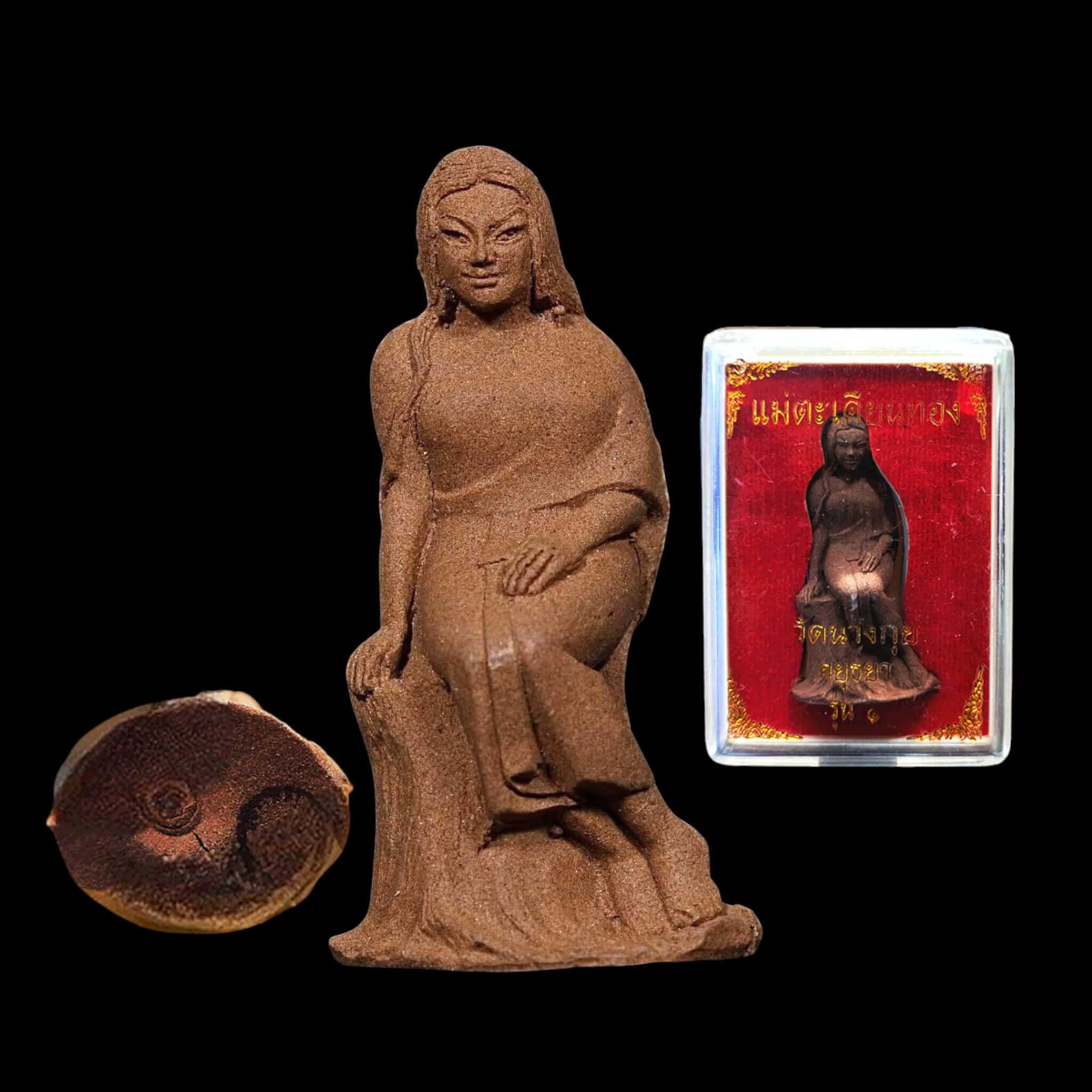 Questo sacro amuleto della Madre Takhian Thong Maha Lap (Mae Takhien) proviene da Wat Nang Kui nella provincia di Ayutthaya, in Thailandia . È realizzato con autentica polvere di legno Takhian, ricavata dal leggendario albero Takhian Thong , un gigantesco albero sacro che ha circondato il tempio per oltre 400 anni , testimoniandone l'intera storia.