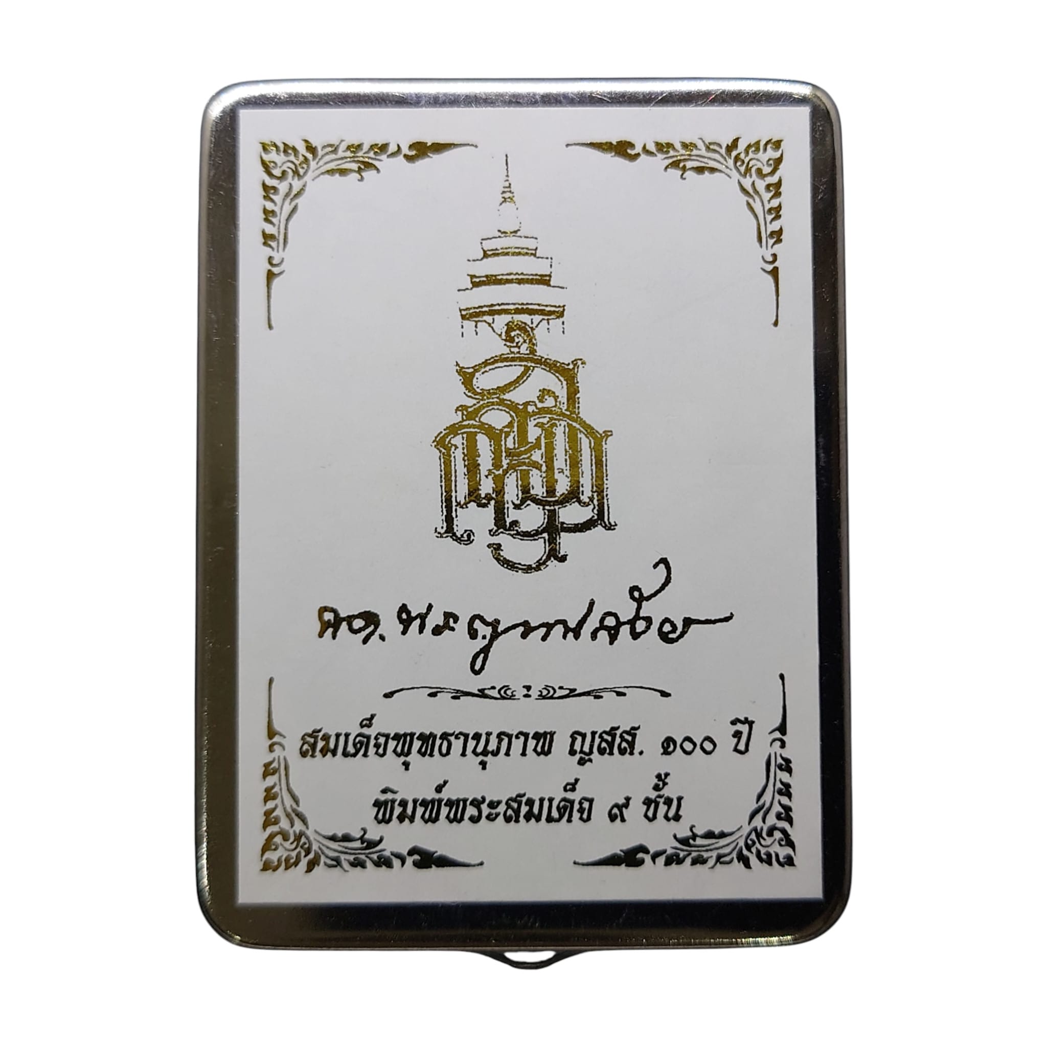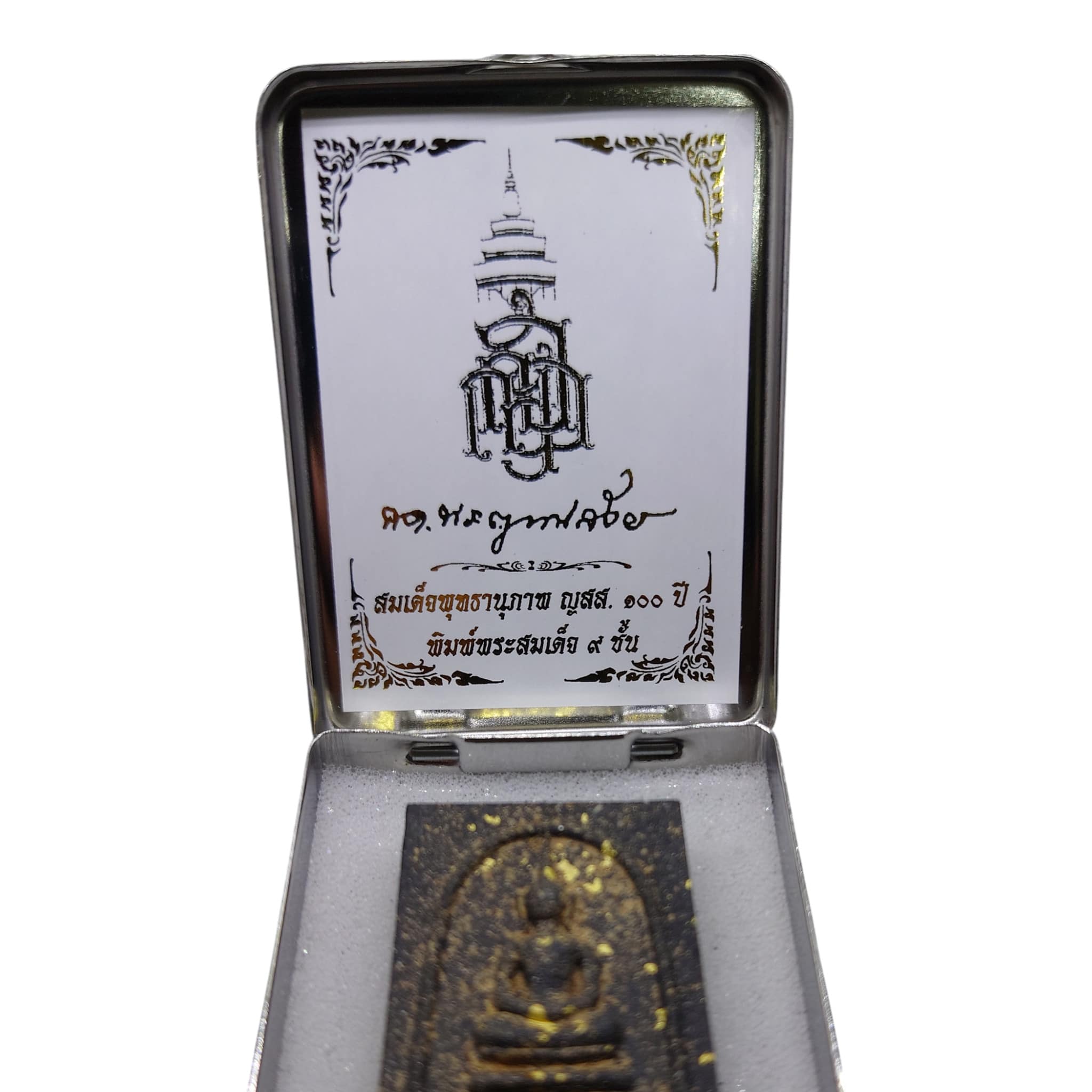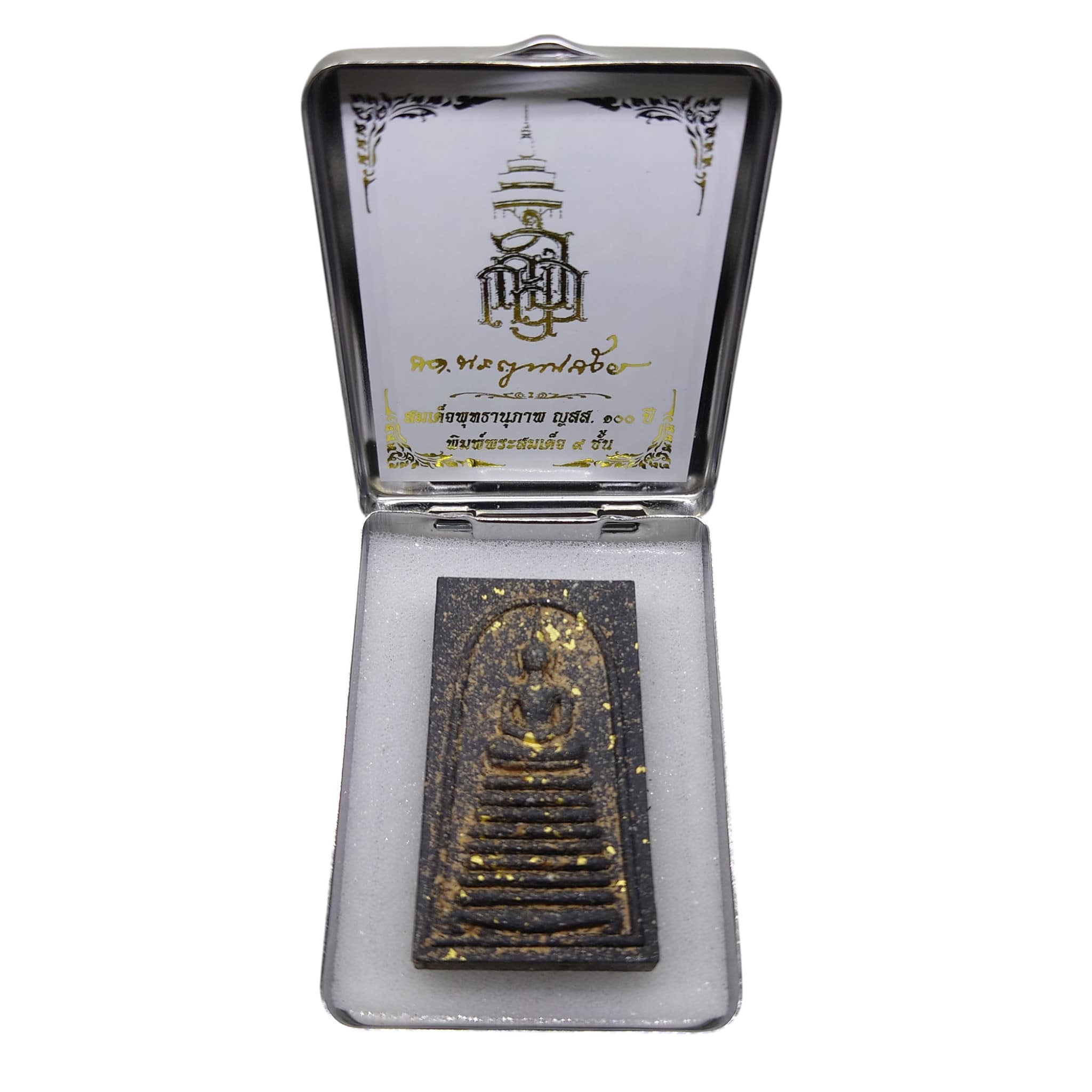 Immagine del Buddha Somdej a 9 livelli, polvere sacra con polvere Bai Lan, Yantra d'argento sul retro, cassa in acciaio inossidabile – Wat Bowonniwet Vihara, BE 2556 (2013)
