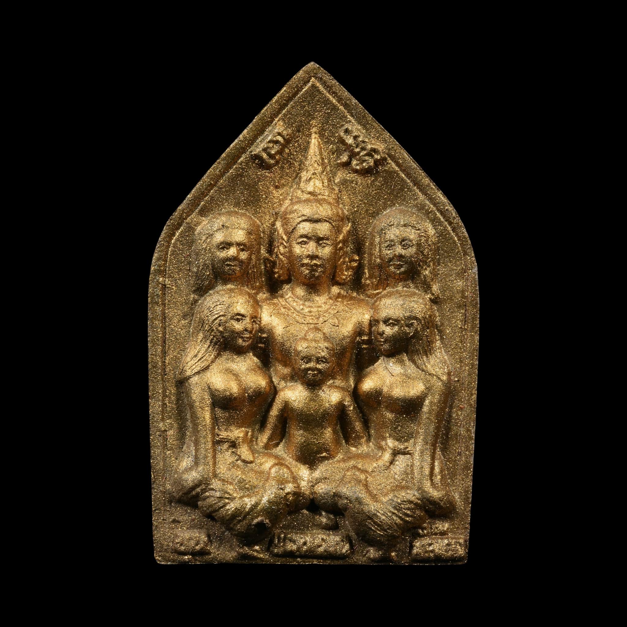This amulet features Khun Phaen surrounded by four Deva maidens, with two Phaya Kai Gaew (Golden Cockerels) resting at his feet, symbols of attraction, charm, sweet speech, and good fortune. A Kuman Thong sits at the center, boosting wealth, merit and wish-fulfilling energy.