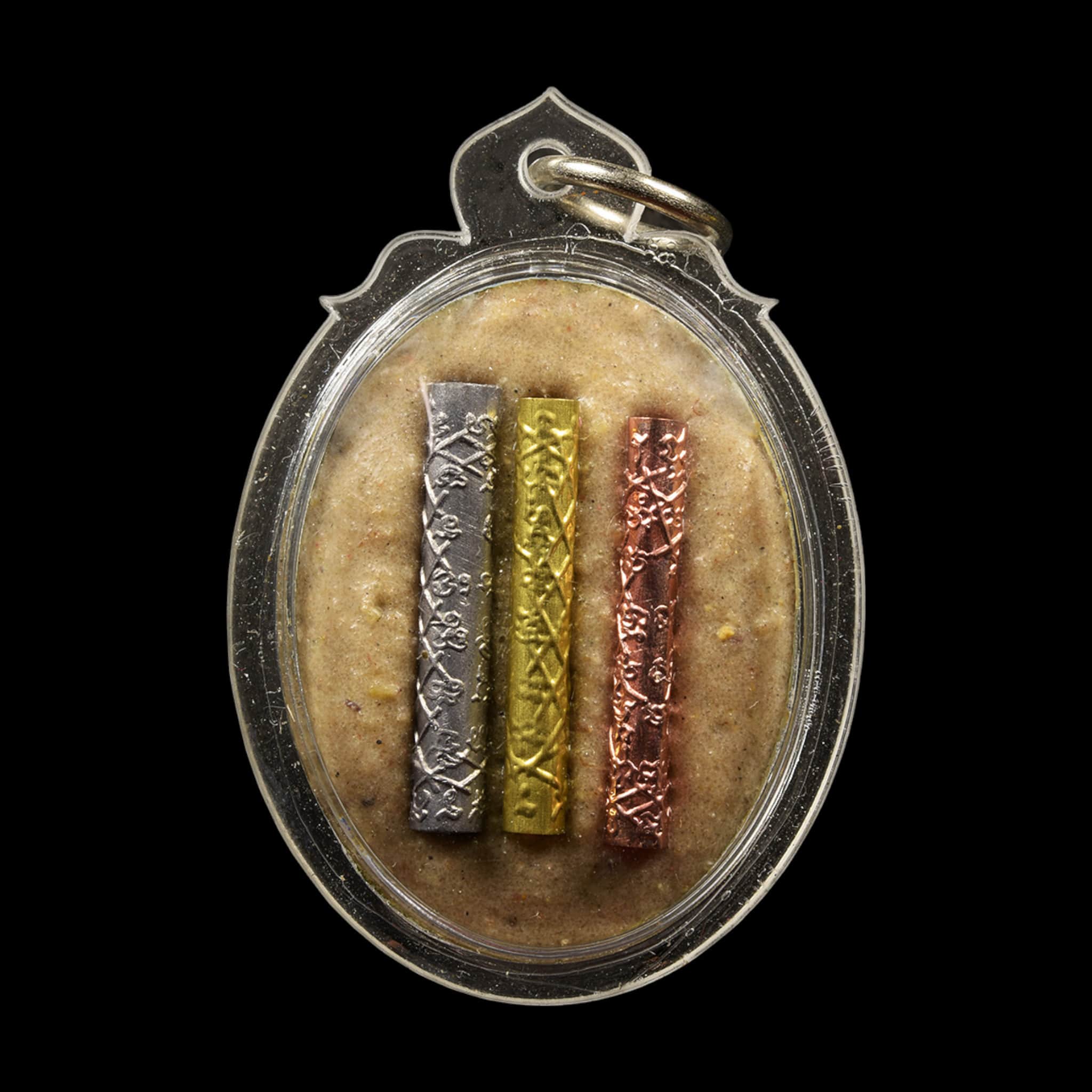 🔹 Back: Embedded Triple-Metal Takrut (Sam Kasat) made from silver, gold, and nawa alloy.