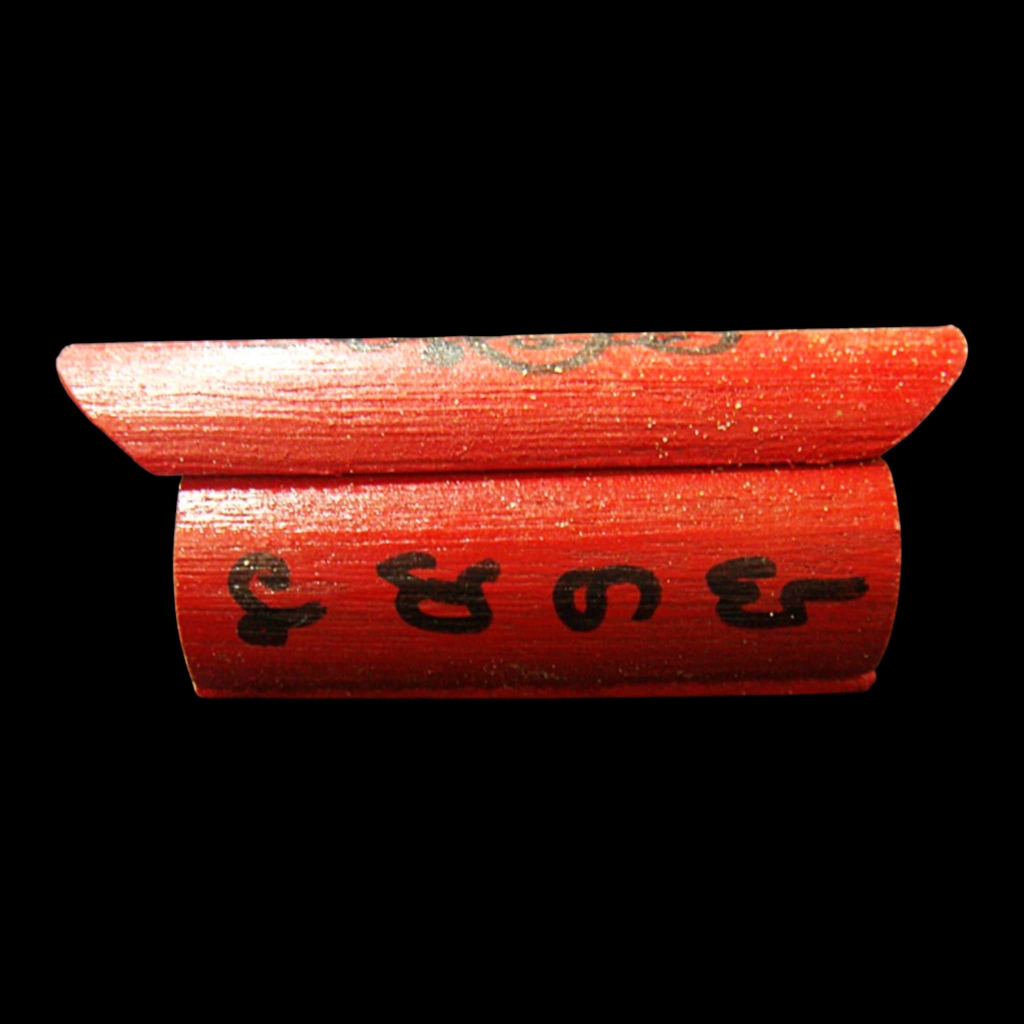 Sacred Material: Hand-formed from Sacred Coffin Wood and painted a brilliant Red, which powerfully channels Chinese beliefs in luck, prosperity and joy. It contains potent herbs and a ghost figure but no human spirit material.